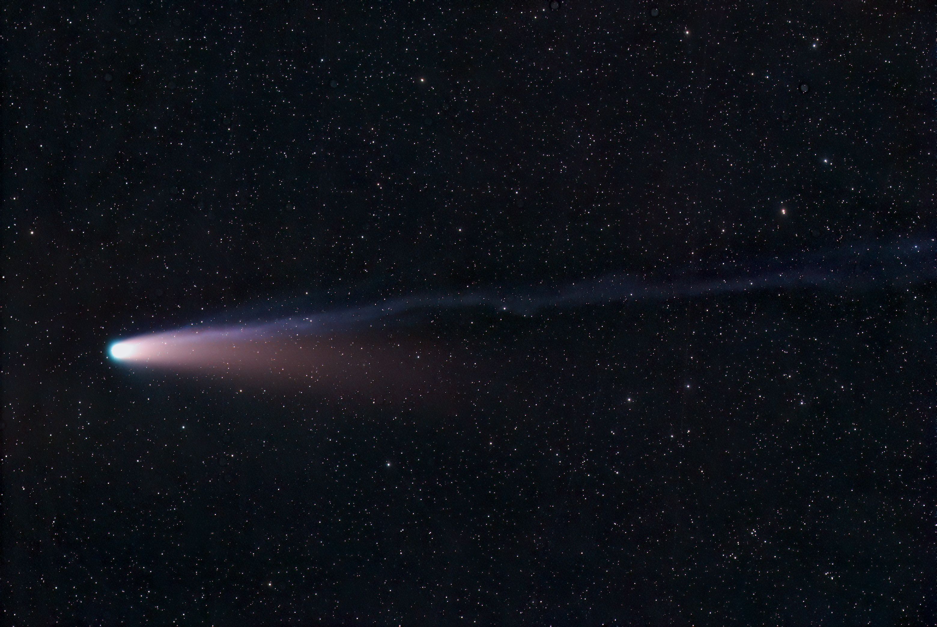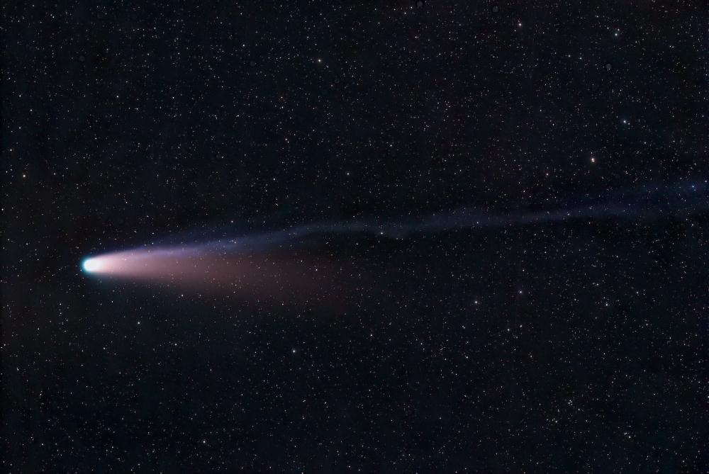 上のひょろひょと伸びているのがイオンテイルで,下のボワッとした赤みがかったのがダストテイルと呼ばれる尾。紫金山アトラス彗星は,この2つがはっきりしなかった。