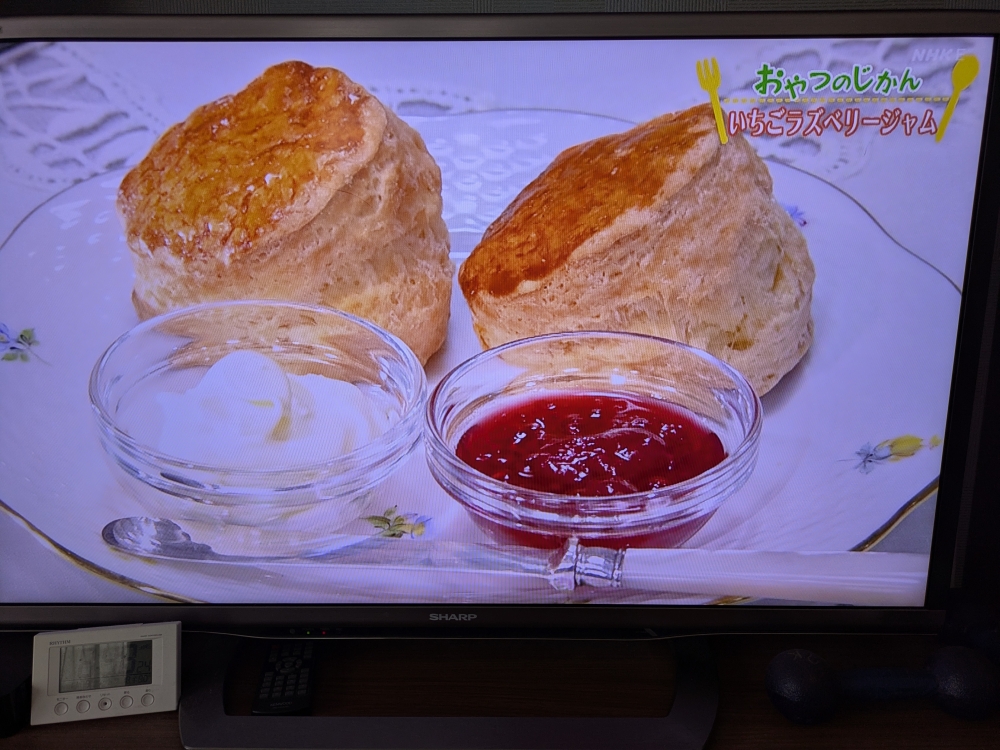 ときどき料理番組などを参考に料理をつくる。半年前に見たNHKのきょうの料理のおやつの時間というので,イチゴとラズベリーのジャムとスコーンの作り方を知り,2度目になるがまた作ってみた。