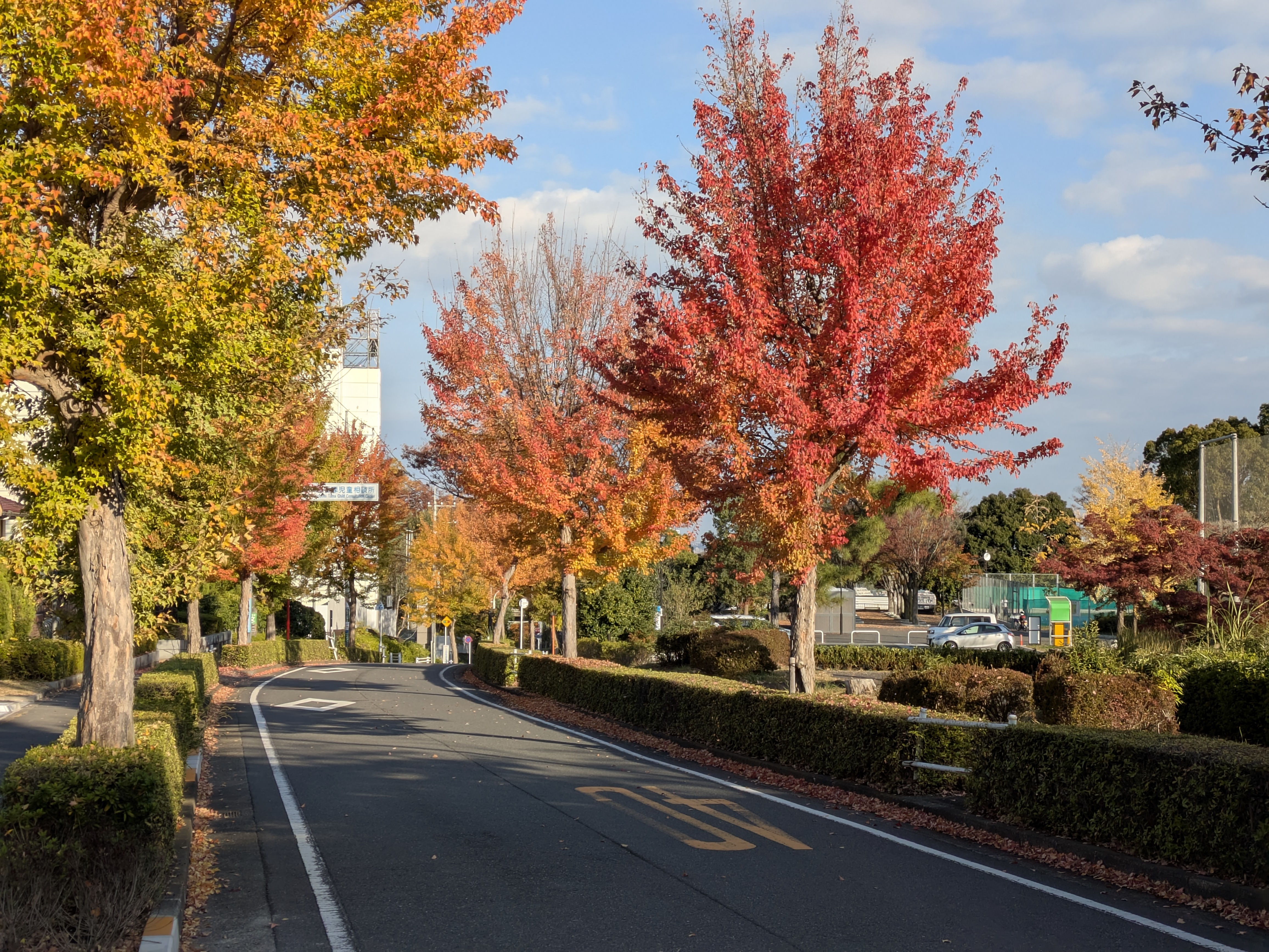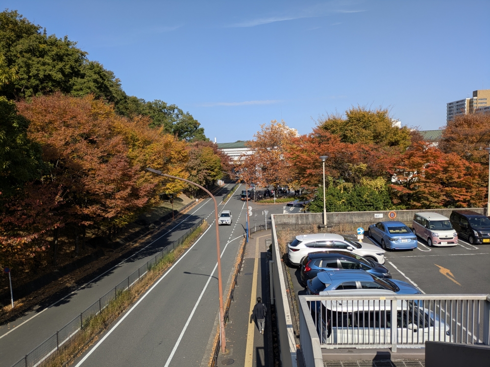 永山一丁目の陸橋から見た永山駅前の黄葉。自転車だと,登りの歩道部分はよろよろして危なかったが,電動だとそんなこともなくなるようだ。買って良かった。