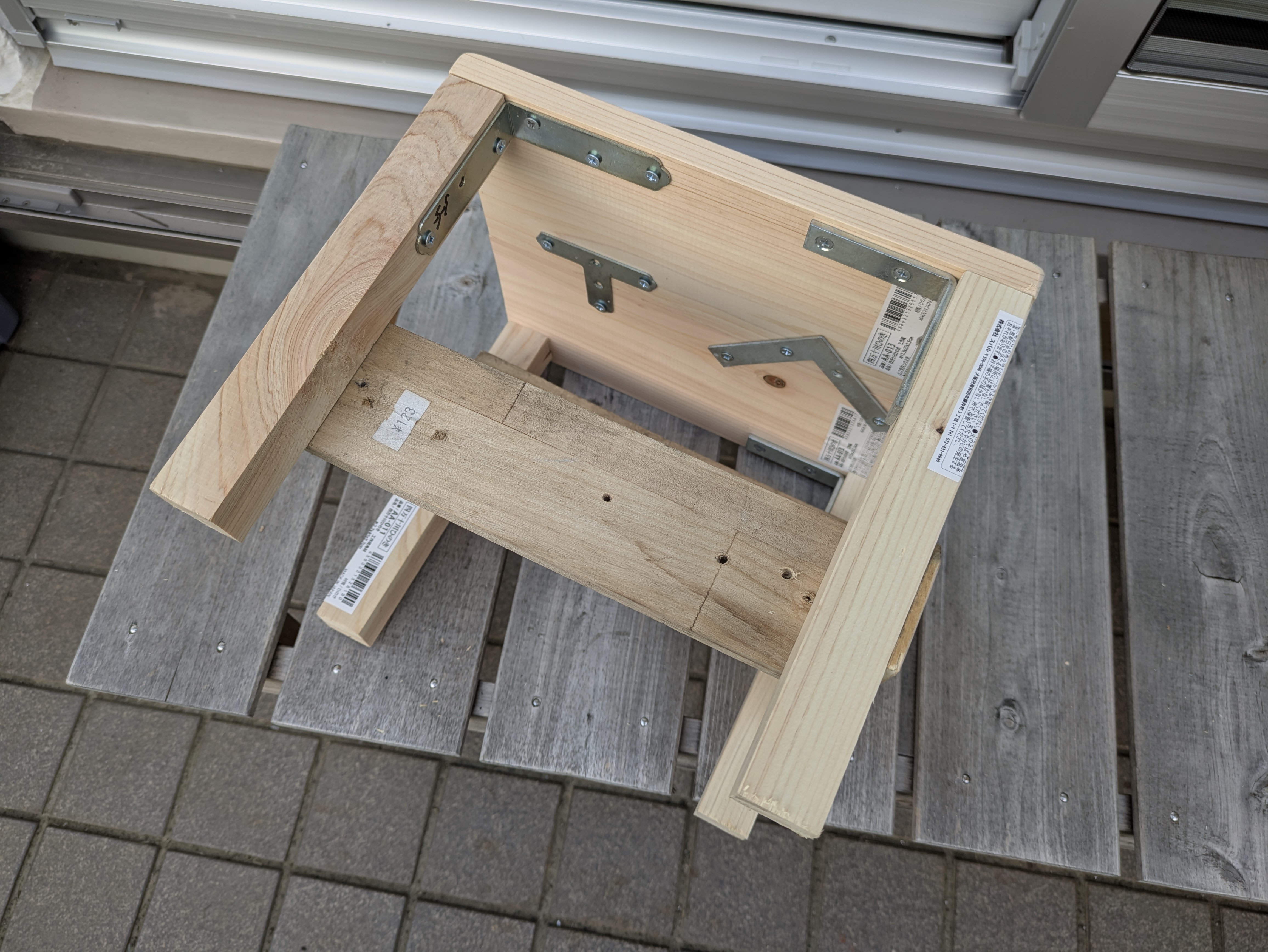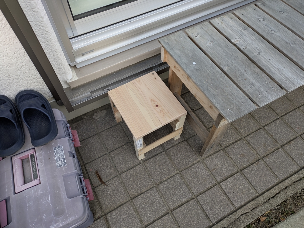 1階のサッシの交換(枠が追加された)工事があって,履き捨てから外に出るときの脚の置き場がなくなったので,踏み台を自分で作った。ヒノキ材は100均で440円と端材。電動の丸ノコとドリルで30分ぐらいで完成。貧乏細工だがこういう作業は楽しい。