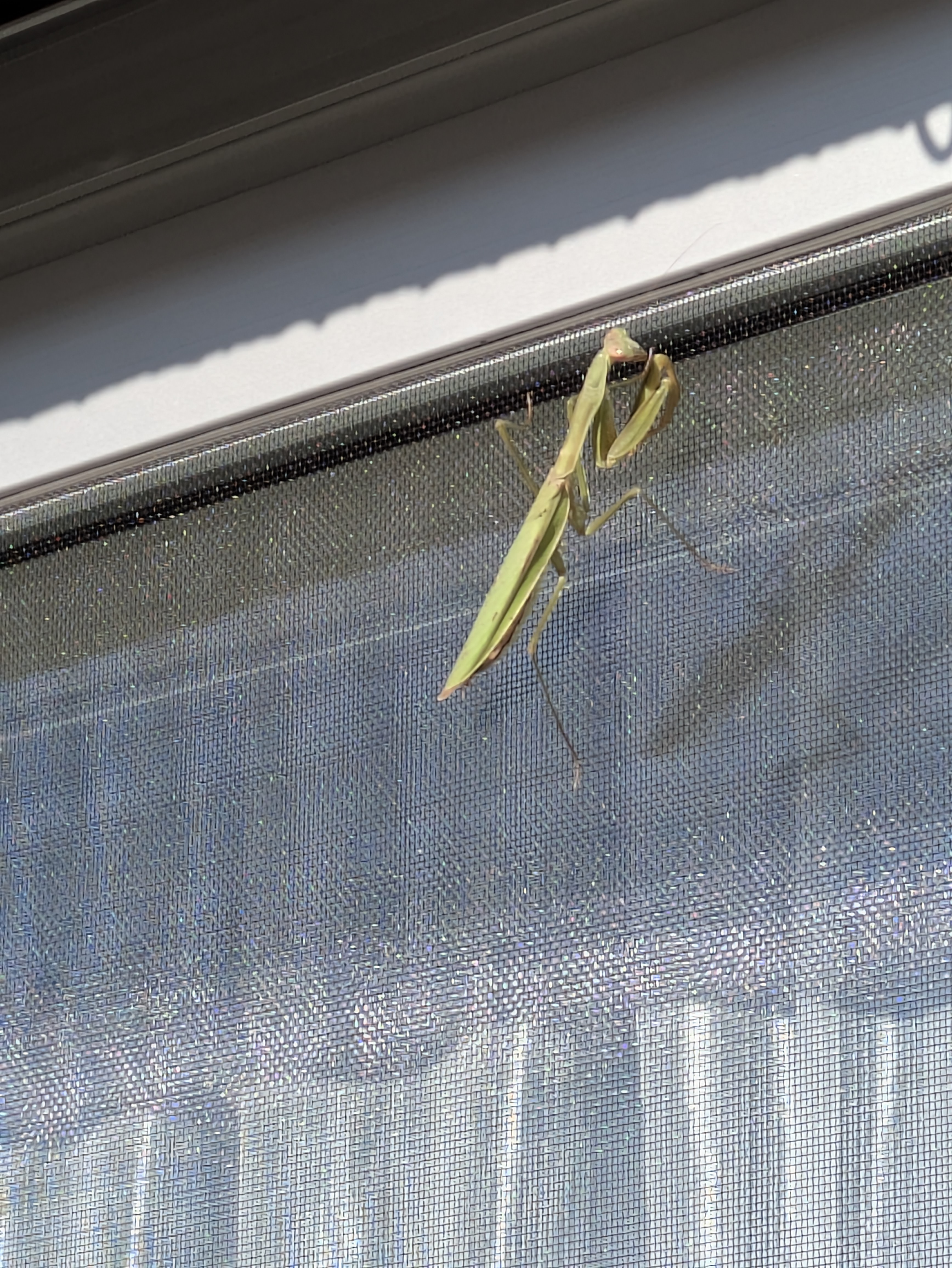 一昨日のことだが庭に面した窓の網戸に,カマキリが止まっていた。昼頃気がついて,前足を折りたたんで,鎌を出さないので刺激してみたが,全然動かず。そのまま,2時間ぐらい網戸にいた。虫といっても,いちばん大きく強いヤツだしなんか,いてくれるとうれしいお守りみたいな頼りにしてしまう存在なので,早速写真をとってかみさんにも報告した。
