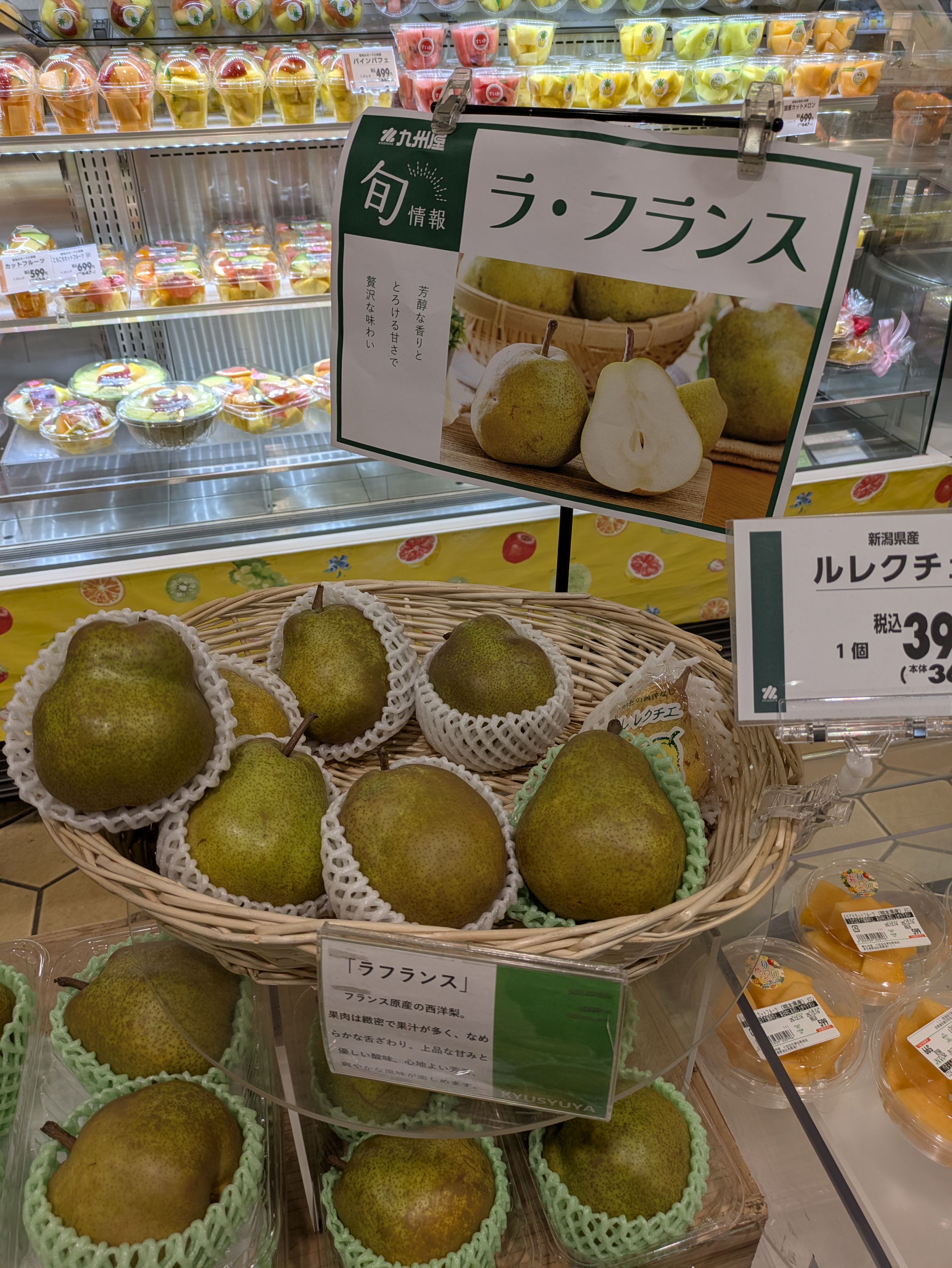 冒頭の写真のように1個1000円以上する。しかし,上の写真(有名百貨店内の果物売り場だが)はルレクチェと書いてあるが390円はおかしい,色合いから見てもただの?ラフランスじゃないの。