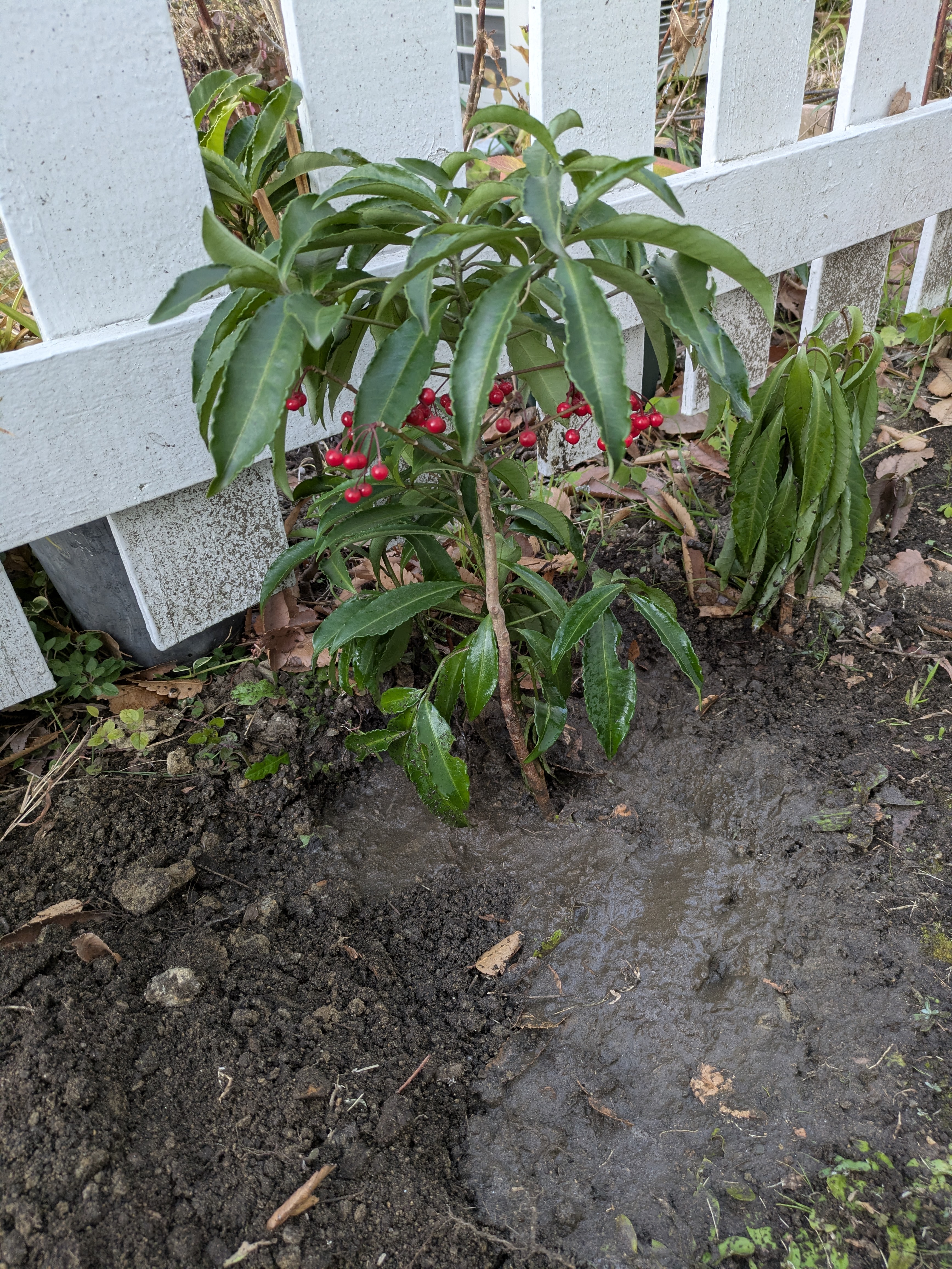 冬枯れというのもなかなか風情があるものだといえる。家にもどるとマンリョウの実がついた株が庭に置いてあった。お隣のIさんが出てきて,裏にあったものだという。以前に自分で掘ってきたのを植えた(右のやつ)けれど,根付かず枯れてしまうのを見てくれて,ガスの給湯器を取り替え工事で邪魔になったのを抜いたので,くれた。早速植えてみたが,根付くかどうか。