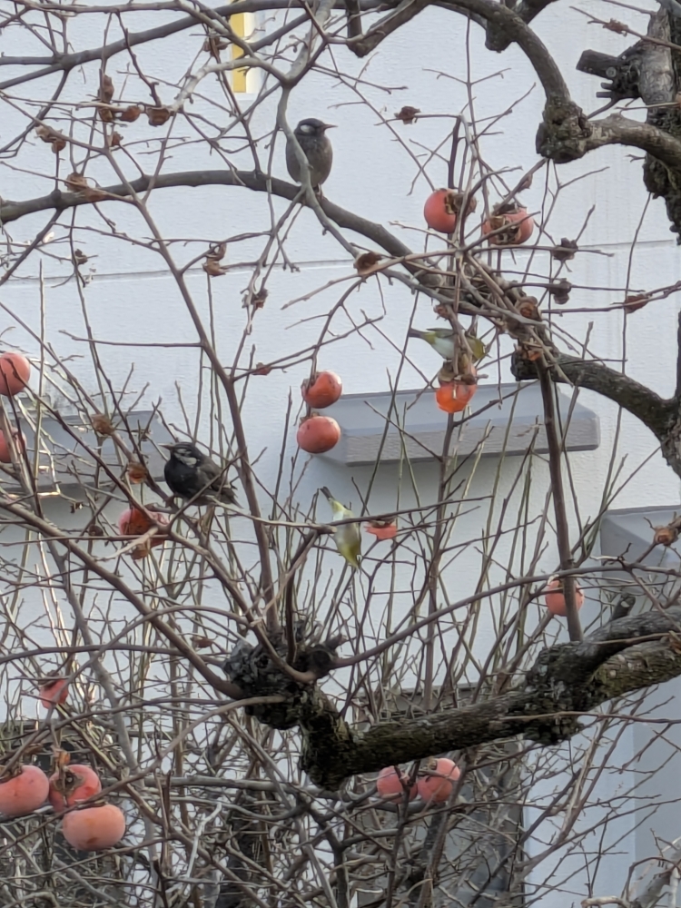 散歩の途中で,メジロとムクドリが枝に残った柿を食べているのを目撃した。