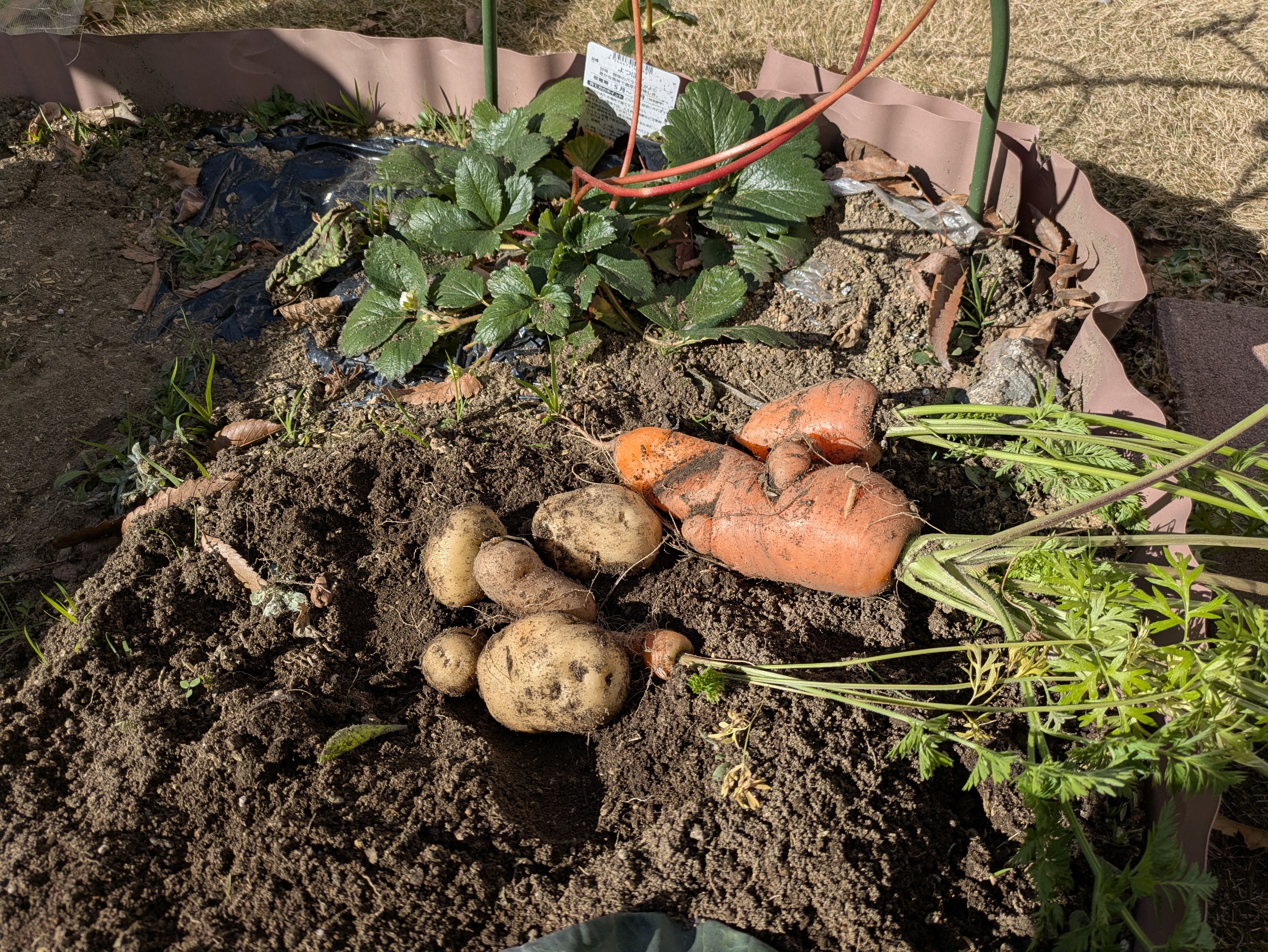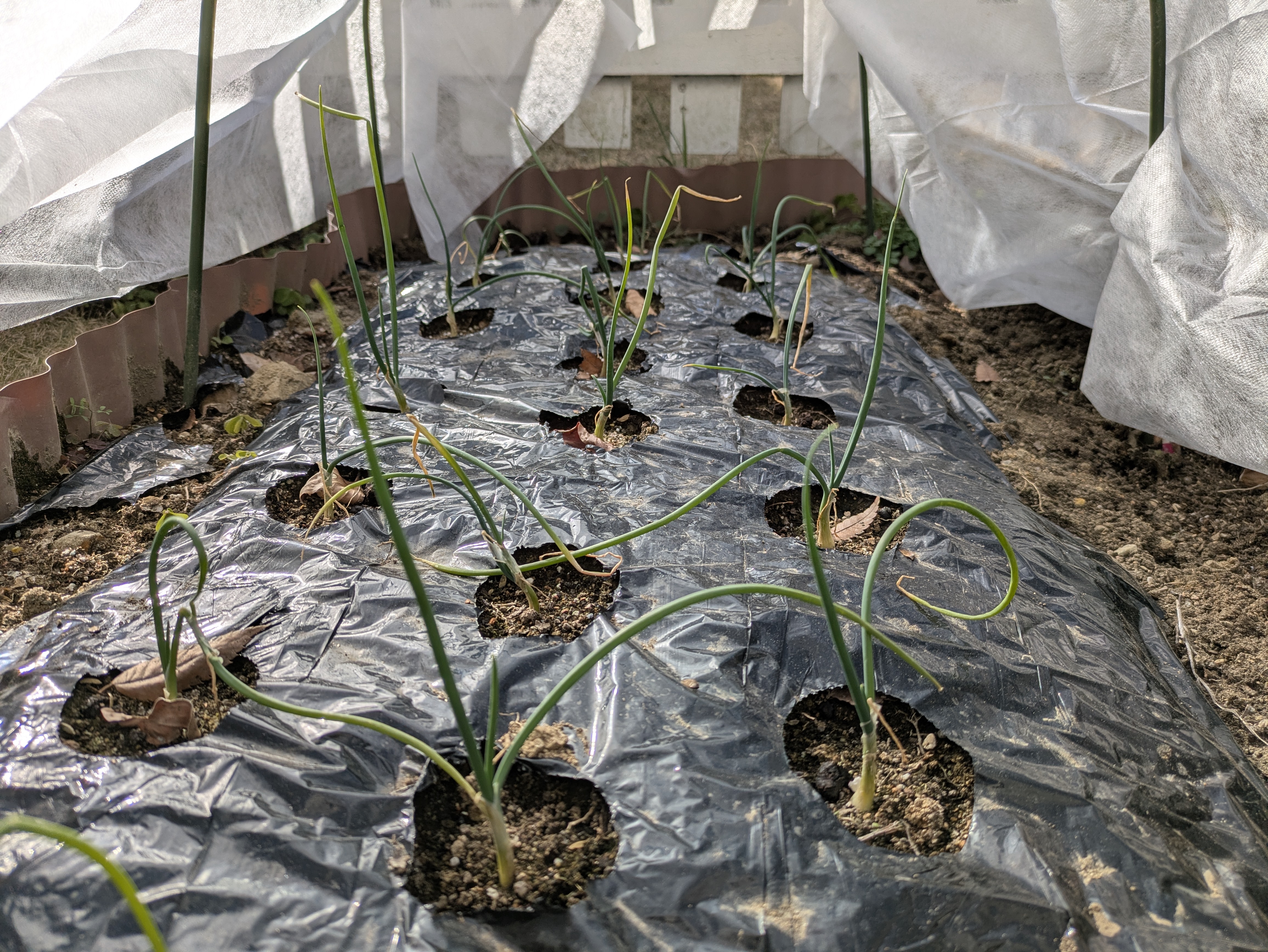 ジャガイモはこれだけしかなかった。ひょろひょろだったタマネギも霜よけで少しずつ育っているみたい。