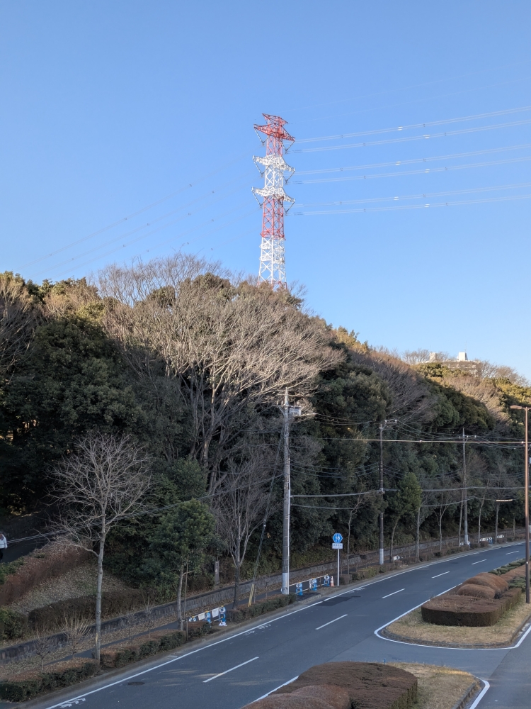 貝取北公園の目印になる赤白の高圧線鉄塔。散歩しているとランドマークになる。
