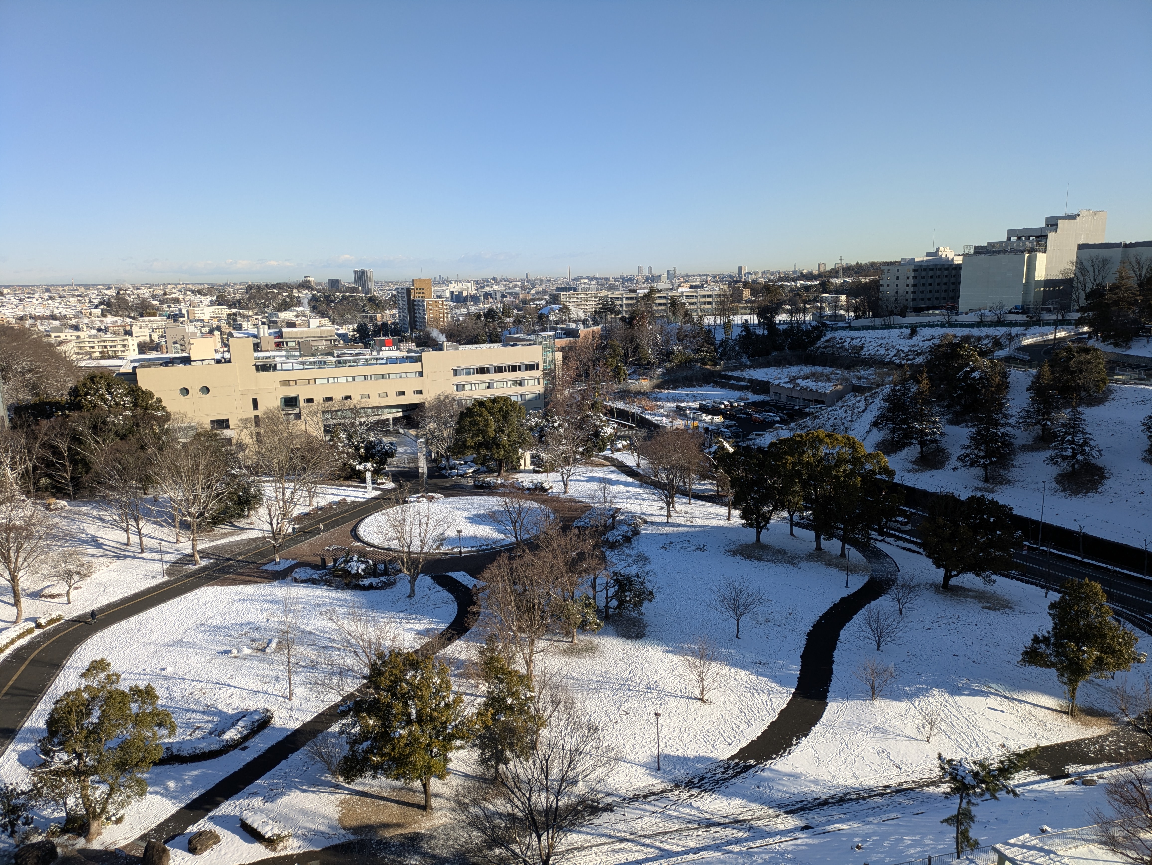 次の写真は,永山北公園のようす(歩道には雪がない)。道路も同様で,車や電車も問題なく運行できていた。