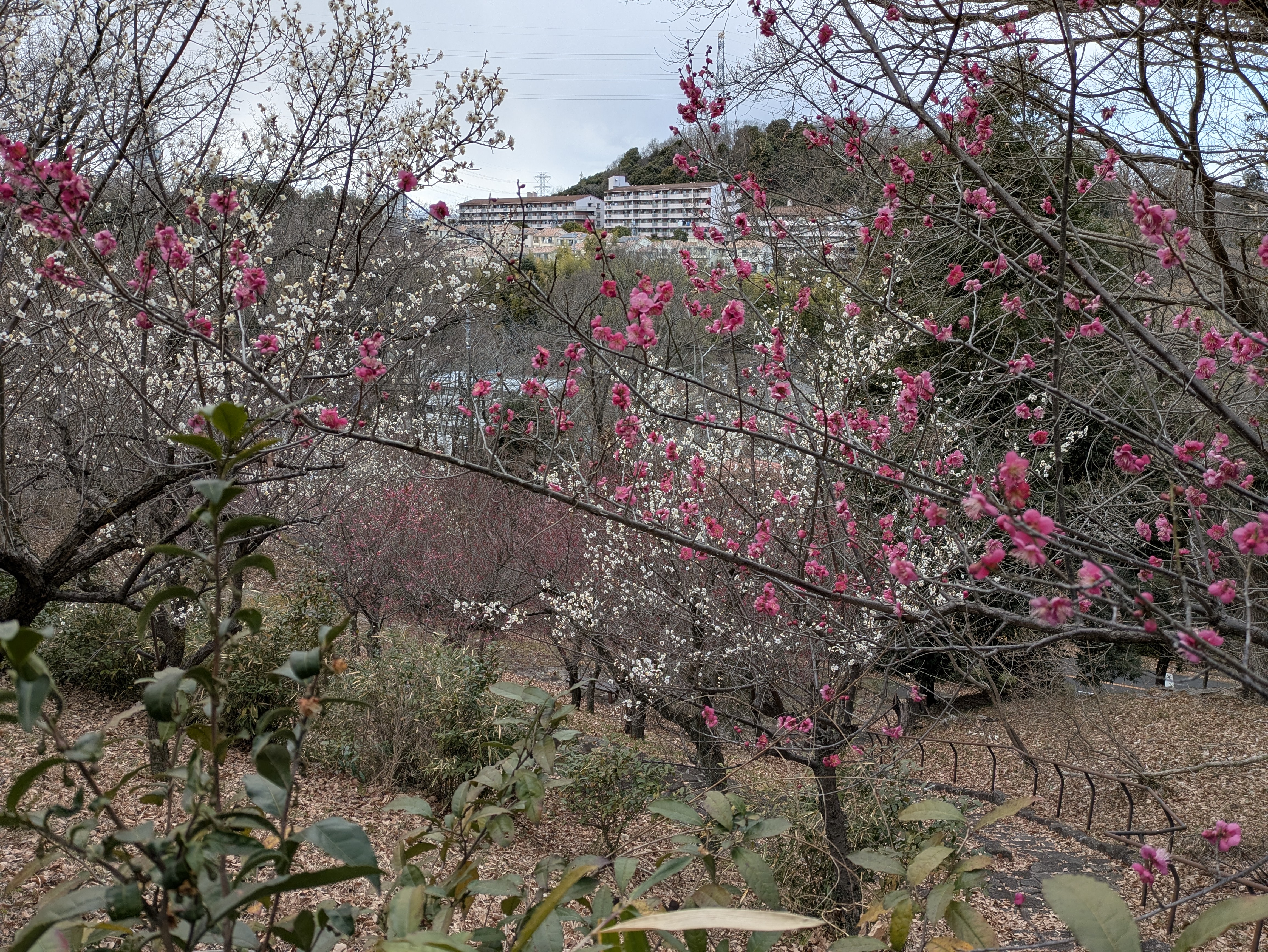 春もやゝけしきとゝのう月と梅 梅が香にのっと日の出る山路かな と芭蕉でもないが,春の兆しとして梅をよく見た。早咲きだと1月中頃から,今日(2月23日)あたり遅咲きが満開になった。今日は最高気温が22℃になるみたいで,風もあるので春一番かもしれない。朝,南永山小学校跡地の土手にほったらかしで咲いている梅の枝を拝借してきて玄関に飾った。あとで剣山と生け鉢を買ってこよう。月待ちや梅担げ行く小山伏 という句もあるようだ。瓜生緑地の紅白梅(2月20日)は2月8日の大雪の頃から咲いていた(次の写真)。